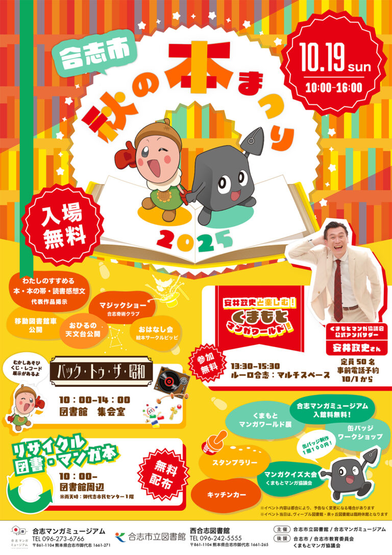 合志市秋の本まつり2025を、10月19日(日)に開催します!! 西合志図書館と合志マンガミュージアムの合同開催です! スタンプラリーやリサイクル図書・マンガ本無料配布、安井政史さんのトークショー! 西合志図書館では、昔