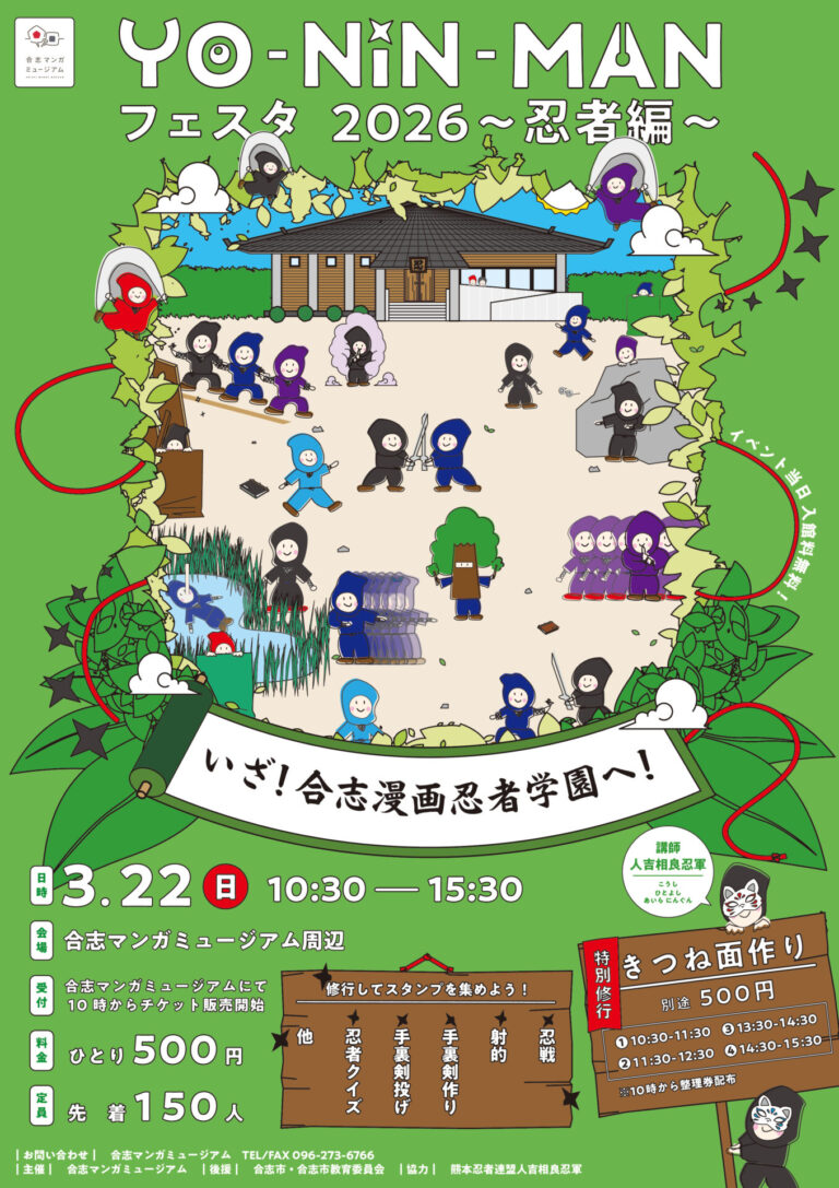 3月22日(日)YO・NIN・MANフェスタ2026~忍者編~を開催します!(^^)/ この日だけ! 合志マンガミュージアムは、こうし漫画忍者学園となります! 一緒に忍者の修行をしませんか?(*’