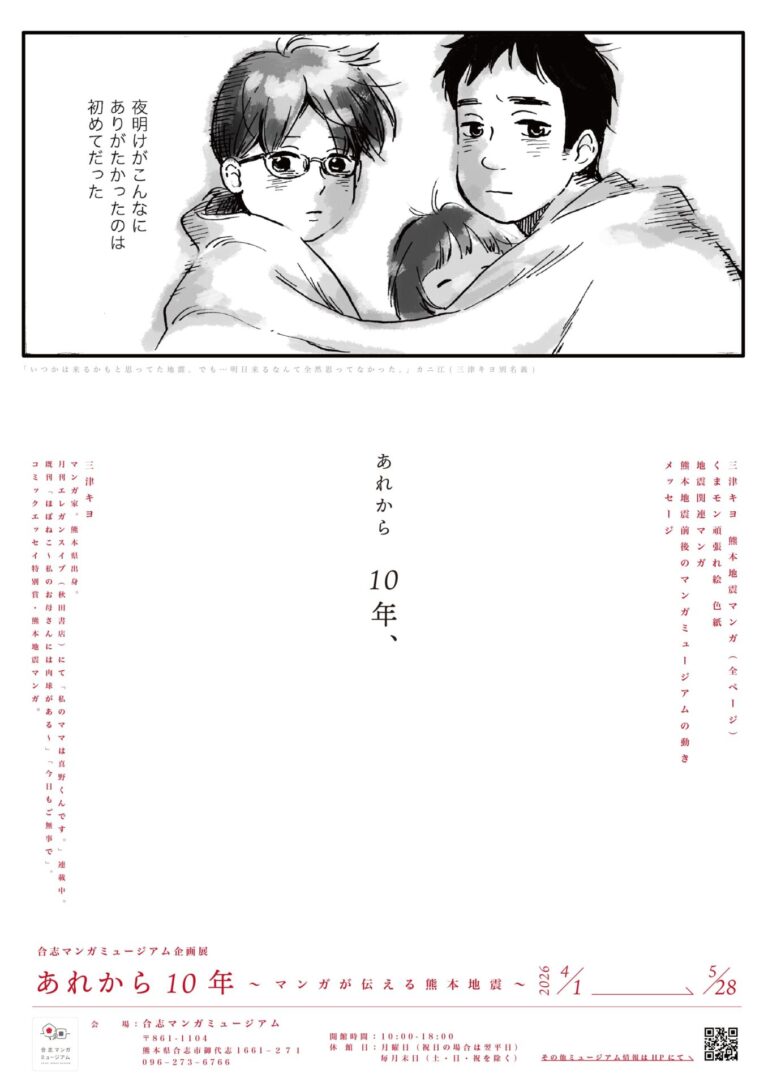 合志マンガミュージアム特別企画展 あれから10年~マンガが伝える熊本地震~ 本年は2016年4月に発生した「平成28年熊本地震」から10年の節目を迎えます。 熊本県出身のマンガ家 、三津キヨ先生による熊本地