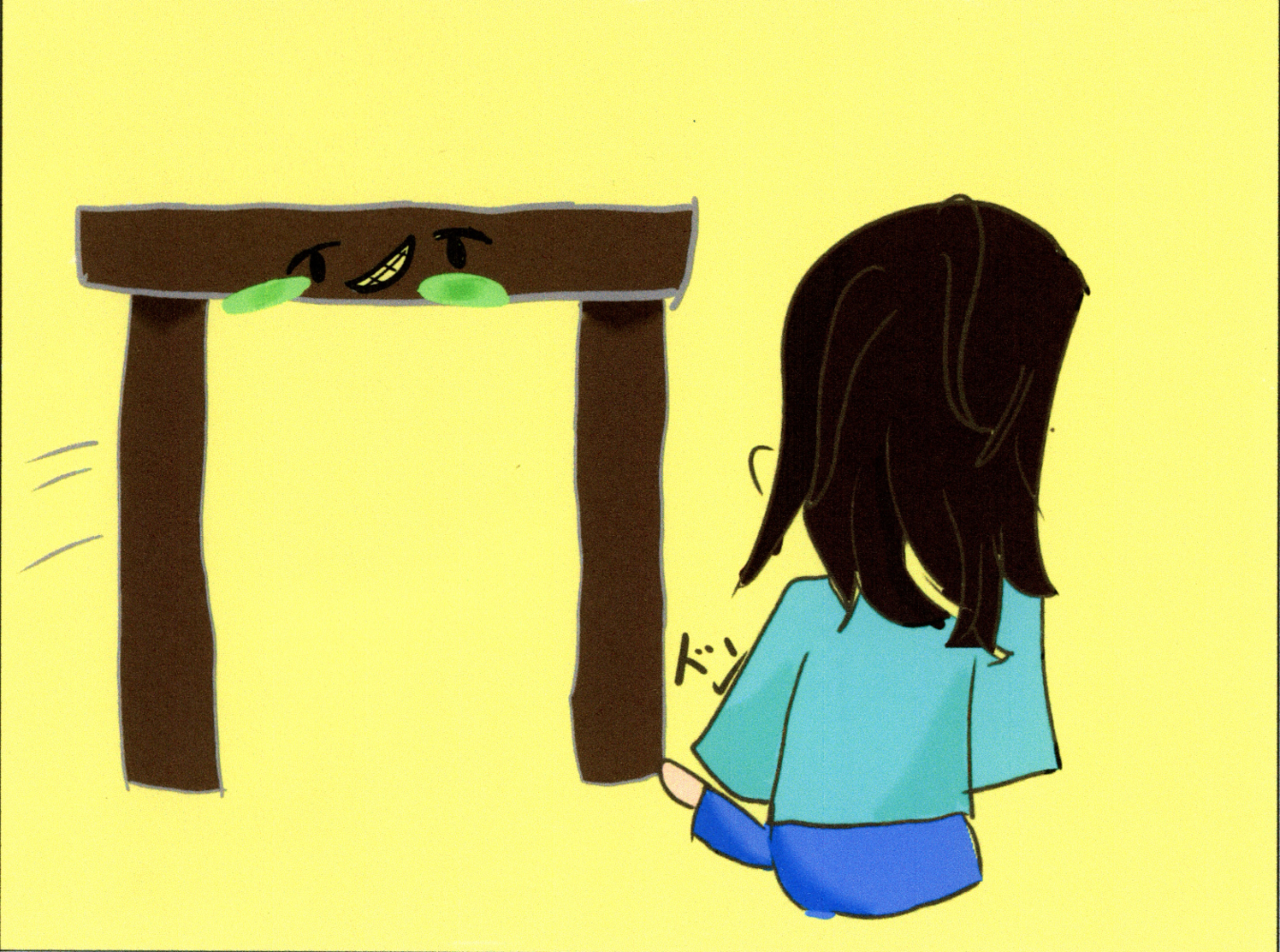 机が手前に動いてくるなんて不思議ですね。机の角に指をぶつけることはみなさんあるあるだと思います。ここに目をつけて妖怪のしわざにする発想は驚きました。背景全体に広がる薄黄色が印象に残りますね。