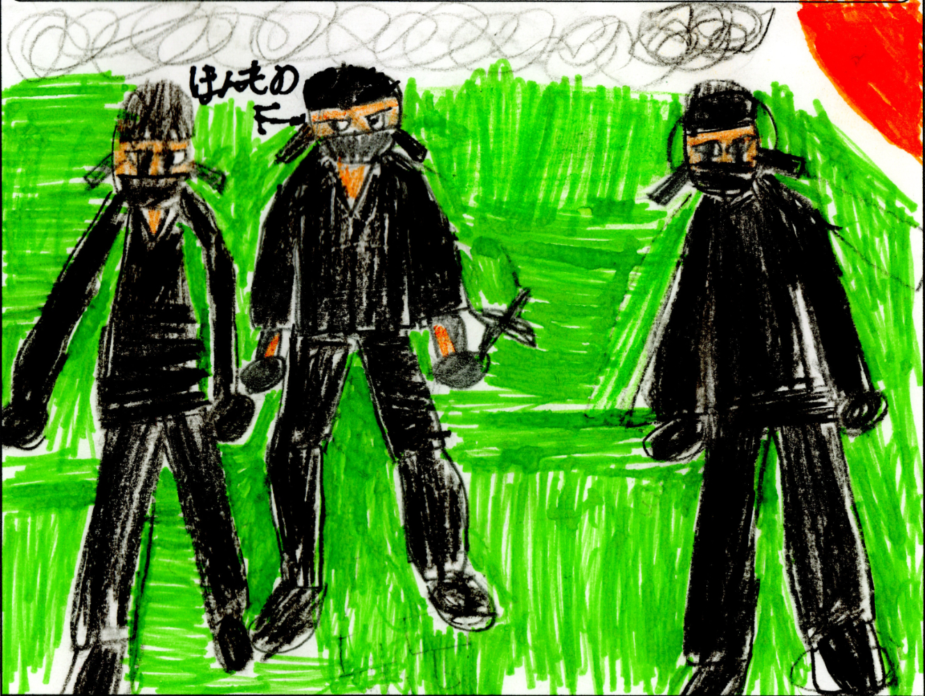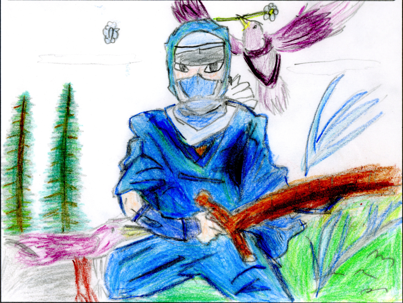 忍者のかっこうが決まっていますね。背景も鳥の絵もとてもじょうずです。手にした木刀は手前にくると大きく見えるように遠近法になっていて、よく描けています。忍者好きの館長の心に刺さりました。