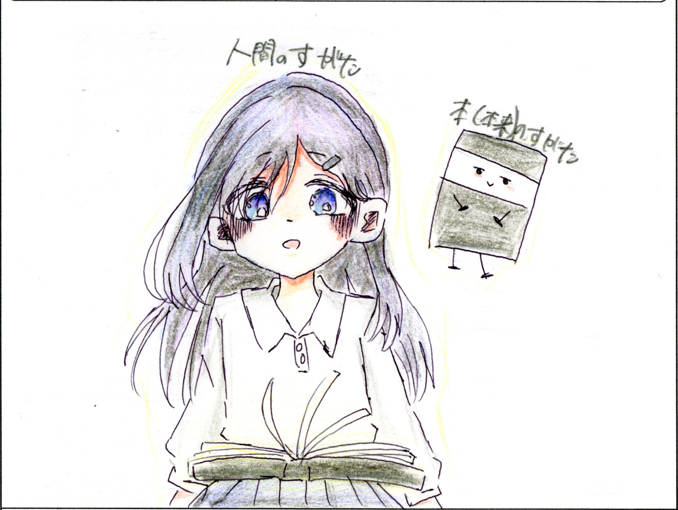 ひと目見た時にキャラクターの瞳に釘付けになりました。マンガのキャラクターとしてそのまま使えそうなほどの完成度です。本のページが3枚めくれている様子もよく描けていて秀逸でした。本来の姿の本のビジュアルも「かわいい!」