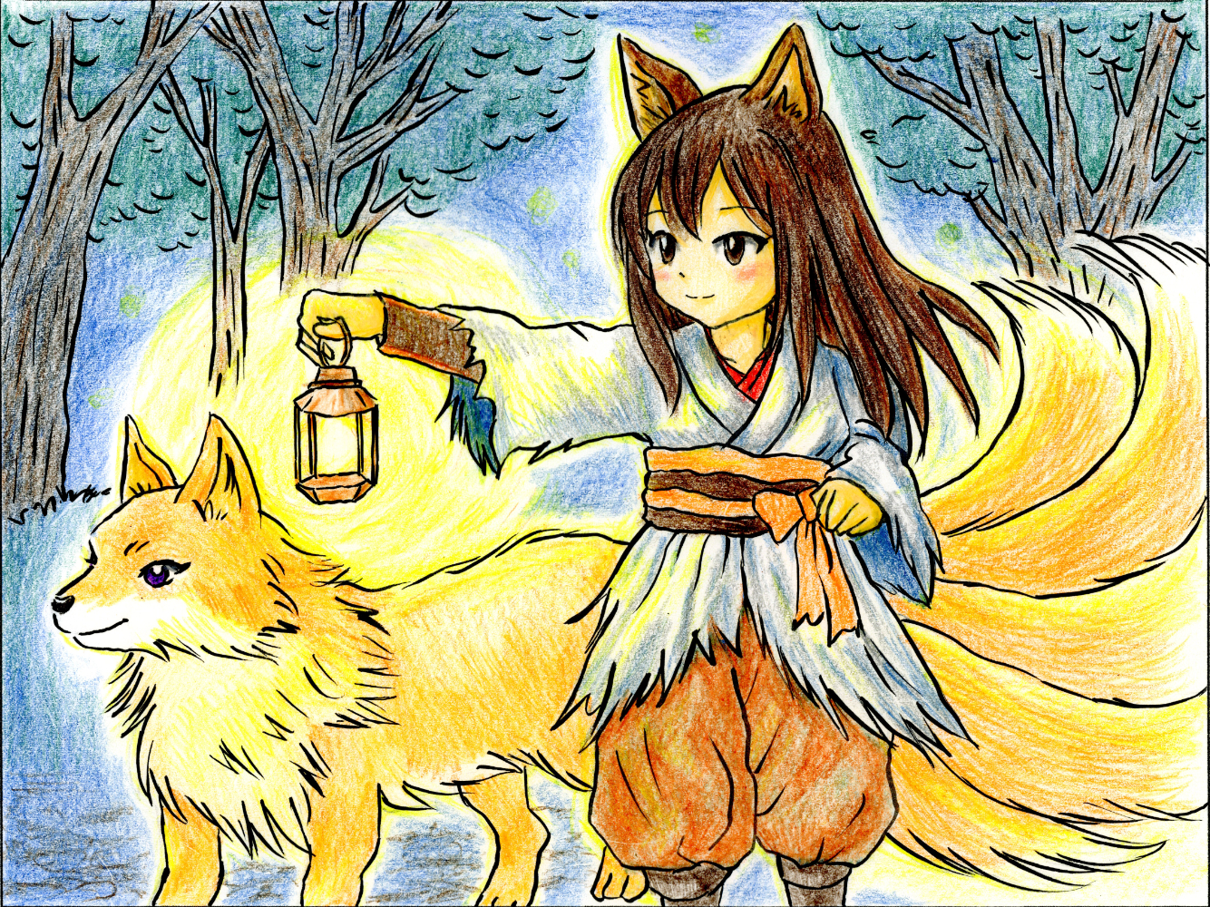 闇夜守は、夜の森で道に迷った人がもうだめだと思ったときに、一度だけ現れるきつね妖怪です。あかりに導かれて、必ず元の道に戻れます。