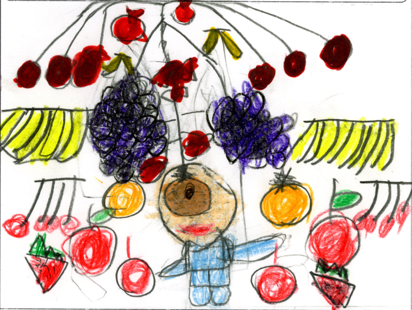 ごはんがない人によってきて、あたまにはえているフルーツをくれる。フルーツのたねもくれて、うえるとフルーツがはえてくるので、おなかがすいてもだいじょうぶ。