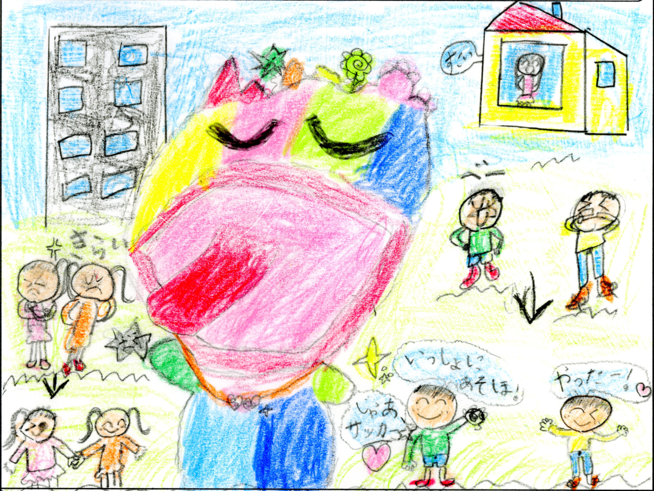 なんといってもトゲまるの顔がかわいい!トゲトゲことばをふわふわことばに変えてくれるなんてサイコーです。描いてくれた子はきっとやさしい心の持ち主なんでしょうね。本当にこんな妖怪がいたらいいなぁ。