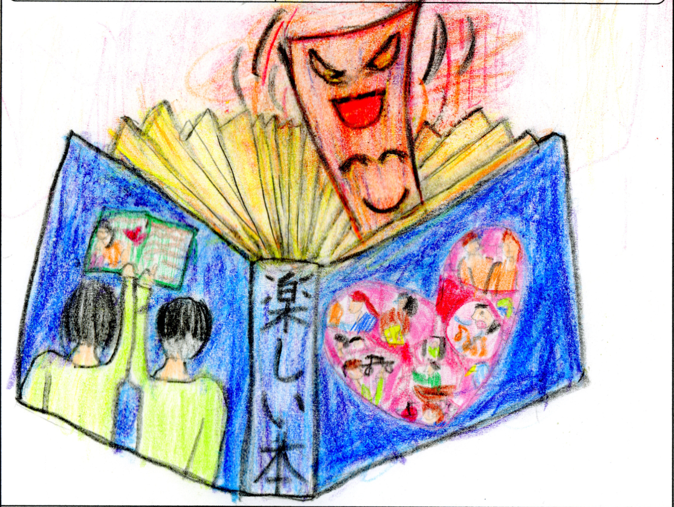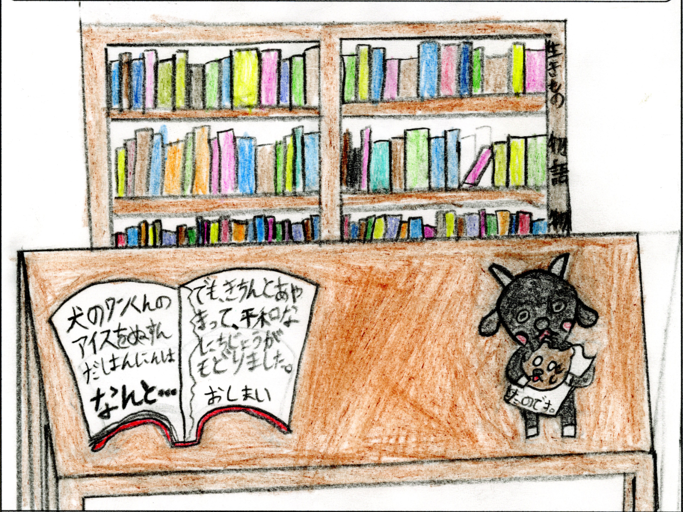 一年生らしいかわいいイラストとアイデアですね。こんな忍者がいたら読みたい本がすぐ見つかって助かります。図鑑、ひみつ本、虫の本、パンの本など細かく描き込まれていて、本当に本が大好きなのが伝わってきますね。