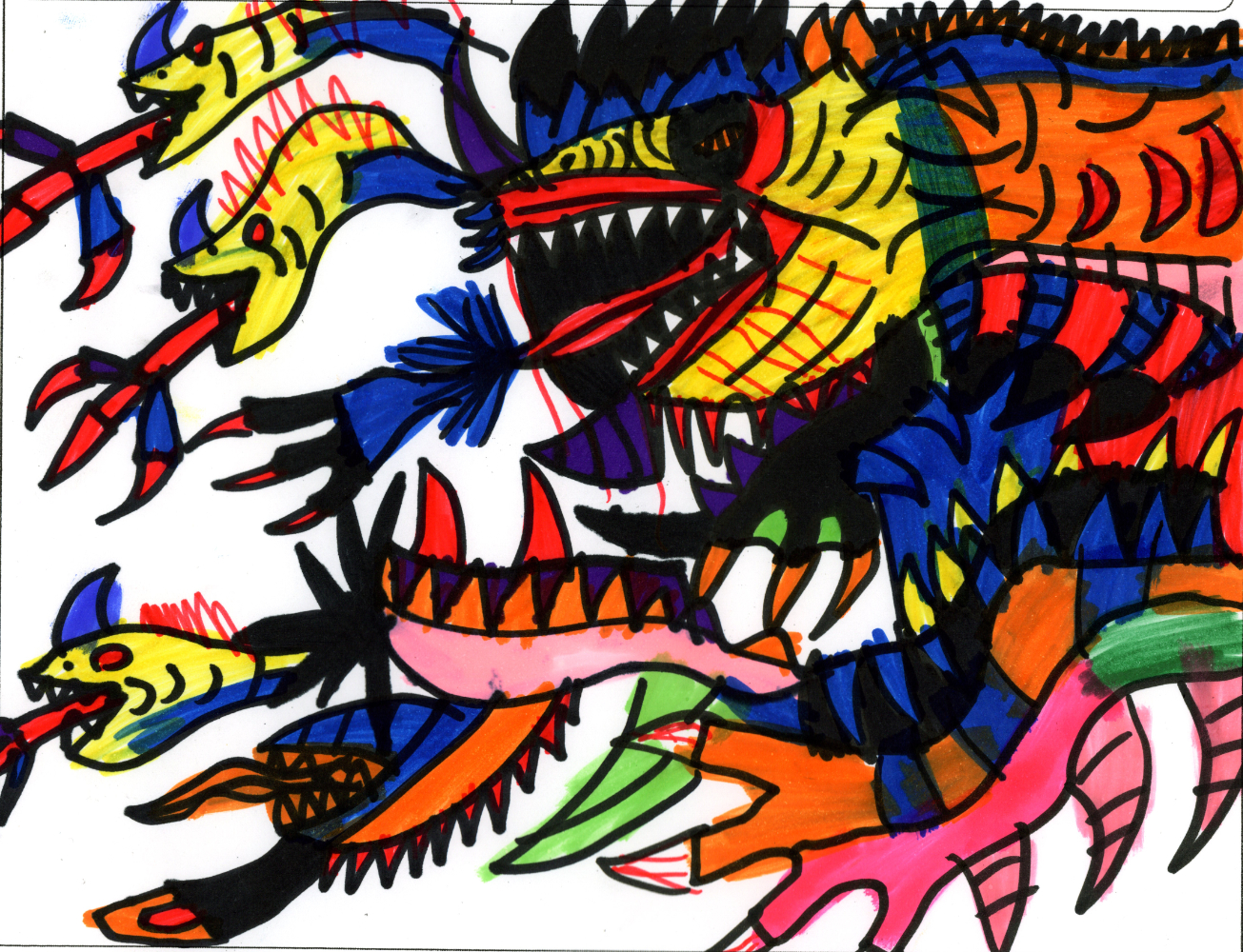 この妖怪、ひと目見た瞬間の存在感がハンパないです。色使いも表情もインパクト充分。たくさんのへびが描きこまれていて、このままアニメにしても通用しそうです。こんな妖怪が夢に出てきたらホントにこわいですね。