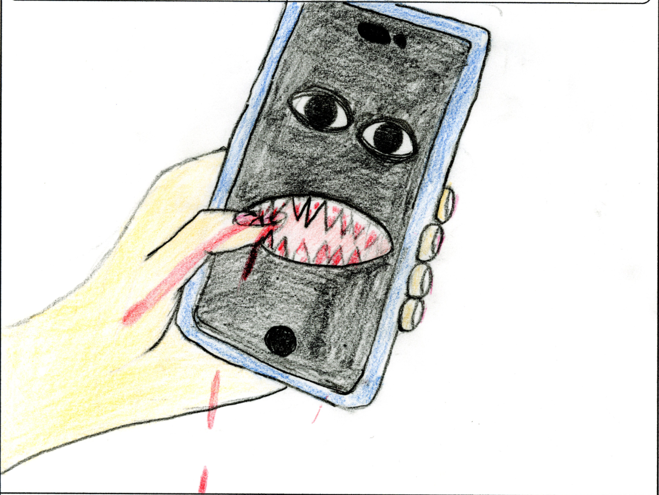スマホをいじりつづけている人のところにくる。スマホに口と目がつき、その口でいじっている人のゆびを食べる。